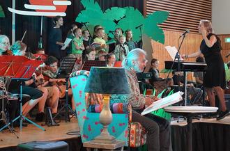 Die Bühne in der Surtalhalle wurde zum Dschungel umgebaut und die Orchesterklassen der Jahrgangsstufen drei und vier der Grundschule Surberg, ließen die vielen Zuhörer gemeinsam mit dem Kinderchor Ruhpolding eintauchen in die wunderbare Mogli-Geschichte. Aus dem großen dicken „Dschungelbuch“ las Erzähler Josef Janka die Abenteuer des kleinen Menschenjungen Mogli vor, der im Urwald bei Wölfen aufwuchs und auf dem Weg zur Menschensiedlung auf allerhand Tiere traf. Das Kinderorchester aus Streichern, Holz- und Blechbläsern, Saiten-, Tasten- und Schlagzeugspieler vermochte mit enormer Spielfreude unter Dirigentin Leonie Janka den einzelnen Textpassagen Leben einzuhauchen. So erklangen zur aufmarschierenden Elefantenkompanie sprichwörtlich Pauken und Trompeten, während bei dem fröhlichen Aufeinandertreffen mit dem lebenslustigen Bären Balu, das bekannte Lied „Probier’s mal mit Gemütlichkeit“ angestimmt wurde. Insgesamt 26 Nachwuchsmusikerinnen und -musiker unterstützt vom 9-köpfigen Kinderchor Ruhpolding interpretierten musikalisch wie gesanglich außerdem Szenen mit den „Partygeiern“, dem gefährlichen Tiger „Shir Khan“ oder dem bezaubernden Mädchen in der Menschensiedlung. Das ganze letzte Schuljahr hatten sich die Orchesterklassen unter der Leitung der Musiklehrer Leonie Janka und Bernhard Lackner von der Musiklehrervereinigung (MLV) Surberg auf diesen Jahreshöhepunkt vorbereitet. Es bedurfte vieler engagierter und helfender Hände, um diese großartige Aufführung auf die Beine zu stellen, wobei Janka besonders Max Lackner hervor hob, der die liebevoll gestalteten Kulissen schreinerte. Langanhaltender Beifall belohnte die Nachwuchskünstler. Auskünfte zum Projekt „Orchesterklasse an der Grundschule Surberg“ gibt Bernhard Lackner von der MLV.