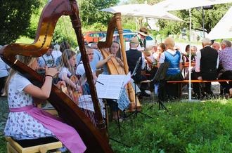 Nahtlos wurde anschließend zum Frühschoppen übergegangen und die Gäste waren schnell mit kalten Getränken und den traditionellen Frühschoppenweißwürsten versorgt. Kaffee und hausgemachte Kuchen, verkauft vom Frauenverein Surberg rundeten das lukullische Angebot ab. Vier Nachwuchsgruppen umrahmten das gesellige Beisammensein musikalisch. Den Anfang machte das Duo Georg Wendlinger an der Ziach und Michael Mühlbacher an der Gitarre, gefolgt von der „Holzwurm-Musi“ mit Amelie Schützinger an der ersten Harfe, Sophia Lang an der Klarinette, Katharina Lohwieser an der Gitarre und Johanna Wolfgruber an der zweiten Harfe. Letztere beiden begleiteten nachfolgend Franziska Eder an der Ziach bevor das Mutter-Tochter-Gespann mit der jungen Harfenistin Ida begleitet von Maria Zillner an der Gitarre den musikalischen Schlußpunkt setzte.