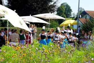 Rund um die in voller Blütenpracht stehende Blumenwiese wurde der Platz vor dem Pfarrheim Surberg beim musikalischen Frühschoppen kurzerhand zum Pfarrbiergarten umfunktioniert. Während sich die Besucher die traditionellen Frühschoppenwürstl schmecken ließen, übernahmen mehrere junge Nachwuchsmusikanten in verschiedenen Formationen mit Ziach, Gitarre und Harfe die musikalische Umrahmung. Die Trachtenkinder des GTEV Surtal-Lauter zeigten schneidig Bauerntänze. Reges Treiben herrschte am Tisch der Ministranten, die frisch geplopptes Popcorn anboten. Große Auswahl bestand am Kuchenbuffet des Frauenverein Surberg.