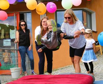 Noch einmal durften sich die Vorschulkinder die beliebtesten Fingerspiele und Lieder wünschen, bevor alle abschließend in das Lied einstimmten - „Aber Griaßde – i mog di so gern“. Ein Torbogen aus Luftballons markierte dann draußen im Garten das Kindergartentor. Unter dem Beifall der vielen gekommenen Familienangehörigen wurde jedes Vorschulkind von seinen Gruppenleiterinnen mit drei kräftigen Schwüngen rausgeworfen, wobei es auf dicken Luftmatratzen weich landete.