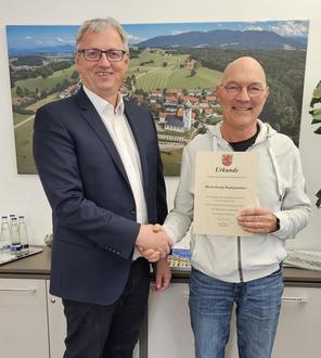Bürgermeister Michael Wimmer gratulierte dem ehemaligen Kämmerer Georg Wadispointner mit einer Urkunde zum 40-jährigen Dienstjubiläum