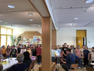 Zum Jubiläums-Aktionstag hatten sich die Kinder wieder einmal ihre Großeltern in die Schulaula eingeladen. Die Teilnahme war überwältigend. Neben den 80 Schulkindern und dem Schulteam nahmen über 90 Gäste die Einladung zum gemeinsamen Singen an.