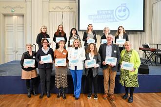 Aus Oberfranken wurden 13 Schule als „Musikbegeisterte Grundschule“ ausgezeichnet. Klemens Löffler, Rektor der Arnika-Grundschule Teuschnitz (vorne, 3. v.r.) konnte aus den Händen von Kultusministerin Anna Stolz das Profilschild entgegen nehmen.