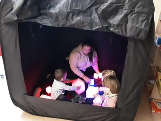 Hierfür haben wir für die Kinder ein mobiles, verdunkeltes Wurfzelt gekauft, das als flexibler Sinnesraum dient. Somit kann dieses Zelt von Gruppe zu Gruppe und auch von Haus zu Haus (Krippe, Kindergarten, Hort) weitergegeben werden und allen Kindern Freude bereiten. Als Spielmaterial für das Zelt wurden außerdem von der Spende noch große Leuchtbausteine und eine Wassersäule mit Schwimmfischen gekauft.