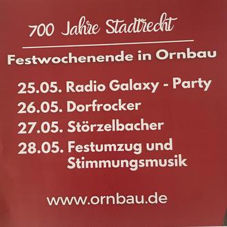 am Pfingstwochenende werden wir gemeinsam die zentralen Feierlichkeiten unseres 700-jährigen Stadtjubiläums feiern. Am Donnerstagabend findet eine Radio-Galaxy-Party mit einem DJ statt, am Freitagabend treten die aus Fernsehen und Radio bekannten Dorfrocker auf und am Samstagabend kommt die überregional bekannte Partyband Störzelbacher zu uns nach Ornbau. Der Sonntag beginnt um 09:30 Uhr mit einem Festgottesdienst im Festzelt. Anschließend gibt’s ein Frühschoppen und der Mittagstisch öffnet ab 11 Uhr. Um 13:30 Uhr beginnt der Festumzug von der Stadtfeldstraße über die Hammergasse durch die Altstadt und über die Weidenbacher Straße bis hin ins Festzelt mit rund 45 Gruppen und über 700 Teilnehmern. Das Festwochenende lassen wir dann mit Musik am Sonntag bis in den Abend hinein ausklingen. Die Planungen und Organisationen laufen auf Hochtouren. Jetzt müssen wir nur noch auf gutes Wetter hoffen. Feiern wir gemeinsam und lassen unsere Stadt hochleben!