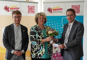 Landrat Dr. Jürgen Ludwig (rechts) händigte Annette Lederer-Heer die 20.000. Ehrenamtskarte aus. Mit der engagierten Ornbauerin freute sich Bürgermeister Marco Meier