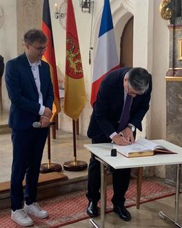 Alexandre Vulic, Französischer Generalkonsul in München, hat sich nach seinem Grußwort während der Restaurierungsfeier des Bièvre-Denkmals, in das Goldene Buch der Stadt Ornbau eingetragen.