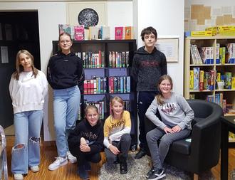 Das Bild zeigt das „Jugend-Team“ vor dem neuen Jugendbuch-Regal. Das Regal wurde von den Jugendlichen neu sortiert und bestückt. Die Anschaffung der neuen Jugendbücher erfolgte aus Vorschlägen der Jugendlichen in Anlehnung an die booktok Bestsellerliste.