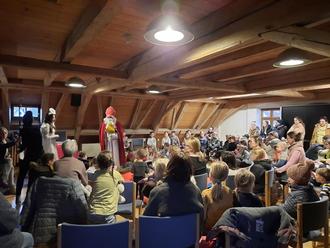 Der Besuch des Nikolauses in der Bücherei am 6. Dezember erfreute sich großen Zuspruchs. 70 Kinder mit ihren einem Eltern- oder Großelternteil fanden sich im Dachgeschoß der Bücherei ein und lauschten den Worten des heiligen Mannes. Nachdem alle gemeinsam ein Lied gesungen hatten, verteilte der Nikolaus und sein Engelchen kleine Tütchen mit Naschereien an die Kinder.