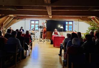 Auch die Mundartlesung am Vorabend des Untermeitinger Christkindlmarktes lockte trotz sehr winterlichen Wetters in etwa 50 Besucher in den weihnachtlich geschmückten Veranstaltungsraum unter dem Dach. Die Mundartgedichte des Dieter Elmer alias Käsmichl und die weihnachtlichen Weisen der Untermeitinger Volksmusikgruppe „Die Lechkiesel“ zauberten für eine gute Stunde eine heiter-besinnliche Atmosphäre und stimmte das Publikum auf den Christkindlmarkt und das anstehende Weihnachtsfest ein.
