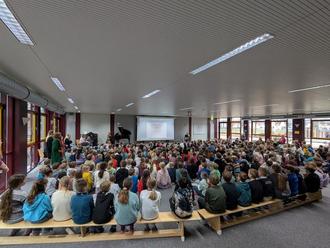 Ein schönes Zusammengehörigkeitsgefühl entstand beim gemeinsamen Singen von allen Kindern mit den Lehrkräften in der Aula. Frisch und fröhlich erklangen die verschiedenen Lieder und Stimmen und machten alle Anwesenden glücklich, ganz im Sinne Martin Luthers: Wer sich die Musik erkiest, hat ein himmlisch Werk gewonnen.