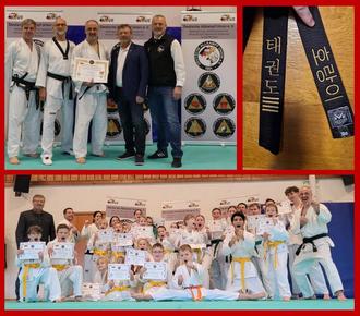 Alle Jahre wieder kommen die Dezemberprüfungen! Den Auftakt gab am 08.12.2024 die Schwarzgurt-/Dan-Prüfung der Erwachsenen. 18 Sportlerinnen und Sportler aus drei verschiedenen Schulen und Vereinen (Untermeitingen, Agawang und Lauingen) legten im Allkampf-Jitsu, im Taekwondo und im Bo-Jitsu (Kampf mit dem Stock) die letzten Farbgurt- bzw. verschiedene Schwarzgurtprüfungen ab. Neben dem Farbgurt-System der Schülergrade ist nämlich auch eine Abstufung innerhalb der Schwarzgurtträger vom 1. bis zum 10. Dan vorhanden. Mit dabei war auch unser Abteilungsleiter, Jürgen Löhning: Supersportler, Meistertrainer, Vorbild und unser Papa-Tiger. Nach stolzen 18 Jahren nahm er die Herausforderung an und legte die Prüfung zum 4. Dan im Taekwondo ab! Bravourös zeigte er sein können im Einschritt- und Freikampf, präsentierte 18. Formen, verteidigte sich gegen körperliche Angriffe und teilte 5 Bretter mit Hand- und Fußtechniken, wobei er die restlichen Prüflinge und Zuschauer durchaus beeindruckte. Für diese Leistung wurde er mit einem neuen schwarzen Gürtel belohnt, bestickt ausnahmsweise nicht mit seinem Namen sondern den koreanischen Zeichen für horangi – Tiger. Zusätzlich brachte der Nikolaus eine Schiefertafel, graviert mit einem Bild. Wir gratulieren von ganzen Herzen zu dieser super Prüfung und sehen nun nur noch mehr zu dir auf!