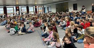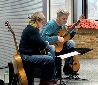 Das Gitarrenduo Saitensprung mit Norbert Neunzling und Edith Lehner, bescherte den Schulkindern und Lehrern eine stimmungsvolle halbe Stunde in der Adventszeit. Mit alten Stücken, gespielt auf originalgetreuen Gitarren und schönen Liedern aus dem verschneiten, hohen Norden, schafften es die beiden, dass über 400 Kinder sehr leise und aufmerksam den Klängen lauschten.