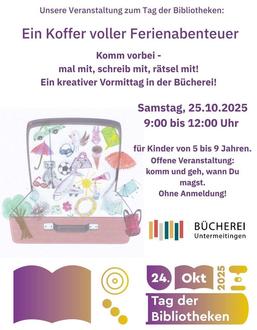 Unsere kreative Veranstaltung Ein Koffer voller Ferienabenteuer! findet statt am Samstag, den 25.10.2025 von 9:00 bis 12:00 für Kinder zwischen 5 und 9 Jahren. Eine Anmeldung ist nicht erforderlich, man kann jederzeit dazukommen.