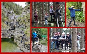 Am letzten Septemberwochenende stand das jährliche HÜTTENWOCHENENDE an. Von den 35 angemeldeten Sportlern fanden sich 30 zusammen, dezimiert durch Krankheit und Terminkollision, um mal wieder drei erinnerungswürdige Tage miteinander zu verbringen. Am 26.09. hier es um 16:00 Uhr Abfahrt in Richtung Kelmen im schönen Österreich, dieselbe Hütte wie im letzten Jahr rief. Oder vielleicht waren es auch die brünftigen Hirsche vor Ort, die das gesamte Wochenende über ihr Bestes gaben, niemanden in Ruhe schlafen zu lassen… da hieß es schon das eine oder andere Mal „Hirsche, überall Hirsche!“. Sobald die Hütte und die einzige Ferienwohnung in Kelmen bezogen waren, ging’s ran an den Speck. Schupfnudeln für 30 Leute wollen ja auch erst mal gekocht sein. Bei frischen 5 °C brauchten alle auch den restlichen Abend etwas Geduld, bis es in der Hütte wohlig warm war, aber lustig wars nichts destotrotz. Die eine oder andere Runde Uno Flip erhitzte zumindest die Gemüter. Warm wurde es auch beim Nageln und Tischtennis in der angrenzenden Scheune. Nach einem ausgiebigen Frühstück (Toast im Toaster kann doch jeder, aus der Pfanne ist die Kunst!) war das Wetter besser als erwartet, daher ging es für die Truppe an die Stuibenfälle in die Nähe von Reutte. Über Waldwege, schmale Pfade und eine Hängebrücke ging die Wanderung vorbei an vielen kleinen Wasserfällen. Highlight war dabei auch das Beobachten einiger kälteunempfindlicher Abenteurer, die spät im Jahr noch beim Canyoning waren. Von der Wanderung aus ging es für die Meisten weiter in die Alpentherme Ehrenberg, zum planschen, rutschen und saunieren. Ein kleiner Teil begab sich derweil zurück zur Hütte, jemand muss ja das Abendessen kochen und eine gute Bolognese braucht nun mal seine Zeit. Mit reichlich Hunger wurde der Abend eingeläutet. Nach Unmengen an Nudeln wurde daher noch ein kleiner Mitternachtssnack gereicht: wie spielt sich‘s besser Uno Flip als mit Käse-Speck-Platte? Manch einer würde sagen „Am besten gar nicht.“. Die Jungend veranstaltete unterdessen einen sportlichen Exkurs: Discofox statt Hausaufgaben. Der nächste Morgen kam für manche früh, trotzdem wurde fleißig zusammengeholfen, die Hütte wieder aufgeräumt und alles in den Autos verstaut. Zum Abschluss eines schönen Wochenendes wurde es nochmal sportlich: das Ziel, der Waldseilgarten Höllschlucht. Die einen kraxelten durch verschiedenste Hindernisse hoch oben in den Bäumen, die anderen versuchten sich in Fokus und Konzentration beim Bogenschießen. Alle hatten jedoch eines gemeinsam: ganz viel Spaß bei einem tollen Wochenende!