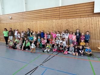 Beim diesjährigen MuVaKiTu-Fest am 21.10.2023 gingen 61 kleine Turnerinnen und Turner an den Start. Begleitet von ihren Eltern und unterstützt durch die beiden Übungsleiterinnen des Mutter-Vater-Kind-Turnens Fanny Lauterer und Sabine Haaphoff und weiteren fleißigen Helfern durften die Kinder über verschiedene Turngeräte klettern, balancieren, rutschen und hüpfen. Natürlich durfte auch ein Purzelbaum nicht fehlen, den die Kinder, dank des regelmäßigen Trainings fast alle sehr gut beherrschten. Natürlich wurden soviel sportliches Engagement und gute Leistungen belohnt. Am Ende bekamen alle Nachwuchssportler eine Medaille und eine kleine Nascherei von Isabella Uhl, Vorsitzende des Sportverein Untermeitingen, überreicht.