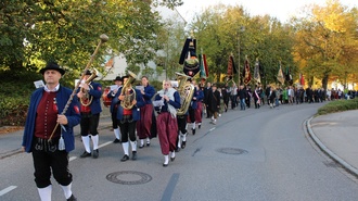 Mit Musik, Fahnen und festlicher Stimmung zieht der farbenprächtige Festzug durch die Straßen von Untermeitingen auf dem Weg zur Festhalle