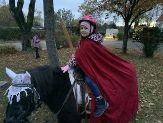 Ein ganz besonderes Erlebnis hatte eines unserer Vorschulkinder. Es wurde ausgelost und durfte auf dem Pony „Maja“ vom Pferdehof Maisterl voranreiten und den Sankt Martin spielen.