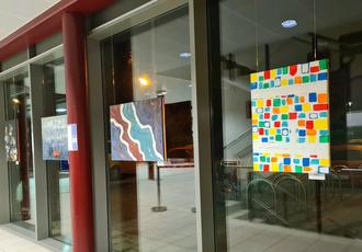Nach der Sommerpause hängen nun wieder Kunstwerke des Kunstkreises Lechfeld in den Glasfronten der Imhofhalle. Von innen und außen sind neue Bilder zu sehen.