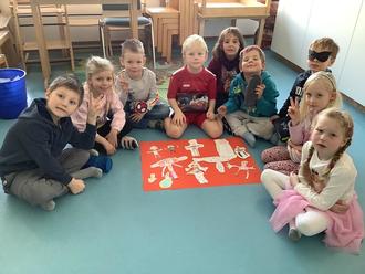 Gemeinsam mit den Vorschulkindern haben wir im Januar in der Bücherei. Die Kinder haben sich viele Bücher ausgeliehen und beim Betrachten des Buches „Vorsicht roter Wolf“, das ganz in blau gehalten ist, äußerten die Kinder, dass unsere Welt bunt ist und sie das schöner finden. Daraus entstand dieses Gemeinschaftsbild.