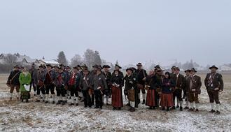 Bei eisiger Kälte und dichtem Schneetreiben versammelten sich rund 40 Männer und Frauen – gekleidet in festlichen Trachten, ausgestattet mit robusten Ledertaschen und altertümlich anmutenden Feuerwaffen – auf dem freien Feld beim REWE in Untermeitingen. Dort positionierten sie sich in einer U-Formation, ehe von einem Gerüst aus das Kommando der 2. Schützenmeisterin der SG Untermeitingen, Tanja Schormeier, erklang: „Böller hoch! 3, 2, 1. Feuer! “