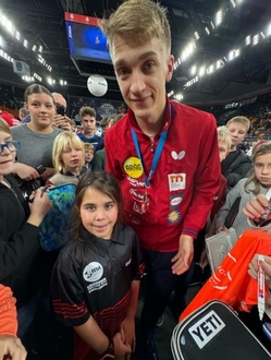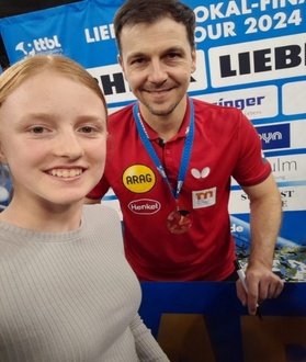 (v.l.n.r.)Sarah Hühn mit Timo Boll