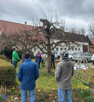Am 25. März fand bei Familie König der Obstbaumschnittkurs statt. Herr Frey vom Landratsamt Augsburg begann den Kurs mit einer Einführung in das Leben eines Obstbaumes. Zum Beispiel, warum der Baum sehr viele Wassertriebe bildet und warum man nicht alle wegschneiden sollte.