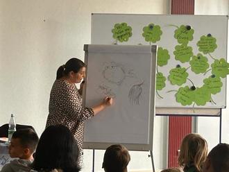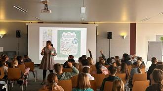 An zwei Vormittagen fand an der Schule eine Autorenlesung statt. Nina Müller ist eine renommierte Kinderbuchautorin, die sich besonders durch ihre bunt bebilderten Lesungen mit ihren Zeichnungen einen Namen gemacht hat. Nina Müller las aus ihrem liebevoll illustrierten Buch `Kuschelflosse´ vor und bezog die Kinder interaktiv in die Geschichten ein. Sie bebilderte die Lesung mit einer Beamer-Projektion und zeichnete die Protagonisten live. Den Schülern bot sich eine einzigartige Welt, die Augen funkeln ließ und alle Ohren fröhlich gespannt waren. Die entstandenen Bilder wurden am Ende von Nina Müller signiert und wir werden sicher in der Schule einen schönen Platz zum Aufhängen finden.