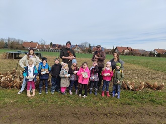 Eine unserer diesjährigen Vorschul-Projektgruppen beschäftigte sich in diesem Jahr intensiver mit dem Thema „Tiere“. Daher besuchten wir im März den Landwirt Anton Hagg und seinen Sohn Patrick in Graben an ihrem mobilen Hühnerstall vor Ort. Sie erklärten uns die Besonderheiten von Hühnern und wie diese bei ihnen leben. Die Kinder hatten dabei sogar die Möglichkeit die Hühner anzufassen und ihre Federn zu fühlen. Als Geschenk gab es dann für jedes Kind ein frisch gelegtes Hühnerei. Zum Abschluss konnten wir die Zeit noch auf dem nahegelegenen Spielplatz nutzen, bevor die Fahrgemeinschaften der Eltern uns zurück in die Kita brachten. Für unsere Kinder war es ein spannender Ausflug, bei welchem viele neue Erfahrungen gesammelt wurden.