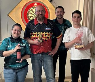 Von links: Sylvia Bessler (2.Platz), Jochen Hartl (1. Platz), Reinhold Zott (Leiter der Sektion Dart), Florian Hartl (3. Platz)