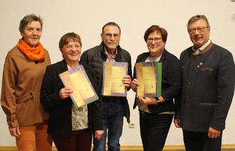 Die neuen Ehrenmitglieder Elfriede Hansen, Leo Weser und Anita Winter umrahmt von den Vorsitzenden Ella Uhl und Friedrich Kosak