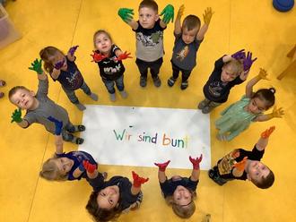 Wir haben dieses Jahr als Sommerfestthema eine Kinderaussage aufgegriffen: „Wir sind bunt.“ Dieses Thema wird uns nun bis zur Schließzeit begleiten. Es geht um Farbe, Musik, Menschen und unsere wunderbare Natur – einfach um alles was bunt ist. Die Kinder zeigen uns jeden Tag wie bunt und schön unser Leben ist.