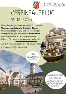 Die Abteilung Turnen und Gymnastik organisiert wieder den beliebten Vereinsausflug. Alle Mitglieder und Interessierten sind eingeladen, am 12.07.2025 einen ereignisreichen Tag in Wangen im Allgäu mit anschließender Führung im Hutmusem Lindenberg zu verbringen. Ausreichend Zeit für geselliges Miteinander ist wie immer auch gegeben.