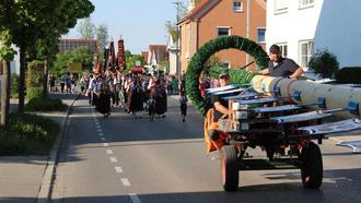 Die Festrede hielt Bürgermeister Simon Schropp, der in seiner Ansprache die Bedeutung des Brauchtums für den gesellschaftlichen Zusammenhalt der Gemeinde betonte. Eine sehr große Schwierigkeit stellte in diesem Jahr die Beschaffung des Baumes dar: Aus Augsburgs Westlichen Wäldern musste mühsam ein geeigneter Stamm gefunden werden. Zudem wurden alle Zunfttafeln komplett erneuert – der Kunstkreis und viele freiwillige Helfer sorgten dafür, dass sie in aufwendiger Handarbeit restauriert und detailgetreu neu bemalt wurden. Die Maibaumwache erwies sich als eine besondere Herausforderung, so Schropp. „Da wir diesmal nicht die gewohnte Lagerhalle nutzen konnten, musste der Baum im Freien stehen – was einen möglichen Diebstahl begünstigt hätte“. Im Anschluss gaben die Böllerschützen drei Salutschüsse zu Ehren des Maibaums ab.