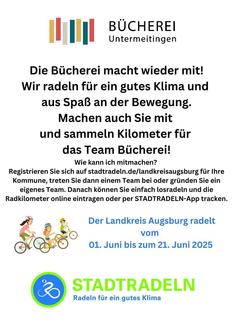 Auch in diesem Jahr nimmt die Bücherei Untermeitingen vom 1. bis 21. Juni am Stadtradeln teil. Wie bereits in den Vorjahren stellen wir ein eigenes Team, das im vergangenen Jahr sogar die meisten Kilometer aller Teams im Ort erradelt hat. Wir freuen uns über zahlreiche Mitradelnde, die unser Team verstärken möchten.