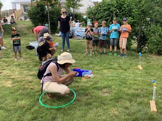 Jede Gruppe der KiTa betreute eine der insgesamt 6 Stationen, an denen sich Groß und Klein ausprobieren konnten. Angefangen beim traditionelleren Sackhüpfen oder Schubkarrenrennen, konnten die Kinder Taschen mit der Batik-Technik gestalten, sich schminken lassen, oder ihr Können bei Wasserpistolenspielen unter Beweis stellen. Besonders beliebt waren die Glitzer Tattoos fürs Gesicht oder auf die Arme bei den Kindern.