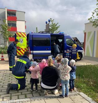 Mit ihrer Gruppe konnten alle Kindergartenkinder und die älteren Krippenkinder ihre Fragen stellen und die Fahrzeuge genau unter die Lupe nehmen.