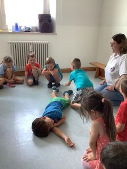Wie im letzten Jahr hatten wir wieder für die Vorschulkinder eine Aktion vom Roten Kreuz bei uns in der Einrichtung. Bei dem „Trau dich“ – Programm der Wasserwacht von Schwabmünchen lernten die Kinder wie man in Notsituationen helfen kann. Sie übten unter anderem wie man den Notruf absetzt, die stabile Seitenlage und wir man einen Verband anlegt. Während der fast 3-stündigen Aktion konnten die Kinder Theorie und Praxis miteinander verknüpfen.