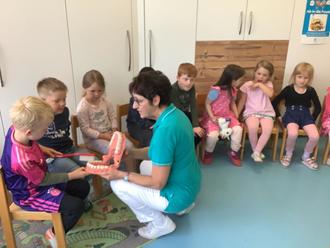 Die Pflege der Kinderzähne ist sehr wichtig für die Gesundheit. Deshalb war auch in diesem Jahr eine Arzthelferin der Zahnarztpraxis Lex in unserer Kita zu Besuch. Für die Kleinsten gab es nur Informationen und eine Zahnbürste. Die größeren Kinder haben über eine Geschichte mehr über ihre Zähne gelernt und wie wichtig, das richtige Putzen der Zähne für uns ist. Zuerst wurde am großen Gebiss geübt und im Anschluss die eigenen Zähne geputzt. Da alle Kinder, die das wollten eine Zahnfärbetablette kauen konnten, gelang das Säubern anschließend besonders gut.