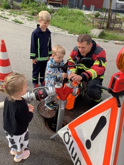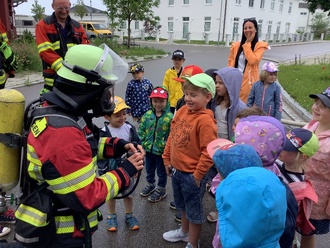 Die Kindergartengruppen und die großen Krippenkinder bekamen Besuch von der Feuerwehr. Vier Feuerwehrmänner der freiwilligen Feuerwehr Untermeitingen nahmen die Kinder auf dem Parkplatz vor der Kita in Empfang. Sie erklärten die Aufgaben der Feuerwehr, wie man sich im Fall eines Feuers verhalten soll und welche Notfallnummer gewählt werden muss. Anschließend zeigten sie das Feuerwehrauto mit dessen Ausrüstung von innen. Auch von außen wurde das Auto ganz genau begutachtet und detailliert erklärt. Zuletzt wurde die Funktion von Hydranten erklärt und die Kinder durften mit dem großen Feuerwehrschlauch Wasser spritzen. Der Freiwilligen Feuerwehr gelang es, den Kindern der Kita am Heuweg mit großer Leidenschaft die Wichtigkeit ihrer Aufgaben näher zu bringen.