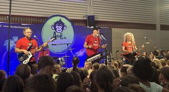 Andi und die Affenbande rockten in der Grundschule Untermeitingen bei einem Konzert in der Turnhalle. Ob als Außerirdische bei der Landung mit dem Raumschiff oder die Burg am Strand – die Affenbande trifft mit ihrem Texten und Melodien das, was Kinder bewegt. Und Bewegung sah man viel an diesem Vormittag! Die Kinder blieben nicht nur Zuhörer: Sie durften mitsingen, mittanzen und mitspielen. Der Sound fetzig, die Texte fantasievoll und frech – da rockten selbst die Lehrpersonen mit oder spielten gleich selbst den Bass für die Zugaben. So heizten die Vollblutmusiker allen ein. Insgesamt war es wieder ein tolles, musikalisches Gemeinschaftserlebnis!