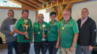Foto: So sehen Sieger aus: Der SV Untermeitingen mit den Spielern von links: Hermann Lauter, Helmut Kahlhammer, Diana Mofia und Walter Sonnabend. Im Bild rechts der 1. Bürgermeister der Gemeinde Simon Schropp, links Wettbewerbs- und Wertungsleiter Helmut Pehmer.