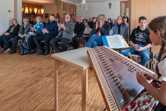 Die fröhliche, herzliche Stimmung der Einweihungsfeier bekam einen wunderbaren Rahmen, weil zur Freude aller Schüler der Grund- und Mittelschule mit Musik und Plattlern beitrugen.
