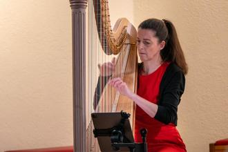 Die hochgewachsene Aichhorn im roten Hosenanzug mit schwarzem Bolero lieferte ein wunderbares, virtuoses Konzert. Hochkonzentriert wechselt ihr Blick zwischen den Noten und den Saiten der schwarzen Konzertharfe, die Fingertechnik ist atemberaubend. Ihr Spiel ist hochmusikalisch, bringt mit Verzögerungen, vielen Wechseln des Tempos und verschiedenen Techniken Emotionen und Spannungen, die die Zuhörer mitnehmen.