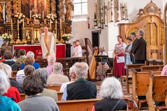 Den Wallfahrtsgottesdienst zelebrierte der Unterwössner Pfarrer Peter Bergmaier mit vier Ministranten. Er erinnerte an die besondere Bedeutung des Dreifaltigkeitssonntags. Bergmaier wies auf das Altarbild, das die Dreifaltigkeit darstellt. Er sieht eine Dreifaltigkeit, in die auch Maria eingebunden ist.