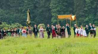 Im Anschluss stellten sich die Oberwössner bei bestem Wetter zur Prozession auf der von der Feuerwehr abgesperrten Bundesstraße auf. Den Anfang machte ein Ministrant mit dem Prozessionskreuz hinter ihm Ludwig Voit mit großen Kirchenfahnen an der mehre Meter hohen Stange. Daran schloss sich die Musikkapelle Wössen an, die die Prozession musikalisch begleitete. Es folgten fein herausgeputzt Trachtenkinder und die von Aktiven getragene Fahne des Trachtenvereins D‘Rechlberger. Vier Dirndln trugen die rückwärtsgewandte Muttergottes. Es folgten die Fahnenabordnungen der Vereine, des Krieger- und Soldatenvereins, der Feuerwehr, der Schützengesellschaft Hochwand und der Gebirgsschützen mit den Vereinsmitgliedern in Tracht und Montur. Vor dem Baldachin gingen der Chor und die Ministranten. Unter dem Himmel trug Pfarrer Martin Straßer die Monstranz. Kommunionkinder und Gebirgsschützen begleiteten ihn. Zum Ende hin folgten der Bürgermeister, Ludwig Entfellner, der zweite Bürgermeister Johannes Weber und Altbürgermeister Hans Haslreiter mit Gemeinderätinnen und -räten. Der Pfarrgemeinderat war dabei. Die alte Fahne des Trachtenvereins D‘Rechlberger führte die Röckifrauen und die Männer des Trachtenvereins an. Bürger und Feriengäste bildeten den Schluss.