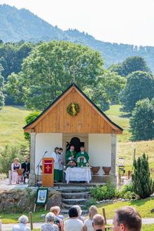 Der Sonntag begann mit einem Gottesdienst mit Pfarrer Martin Straßer am Altar vor der Kapellentür. Die Sitzreihen vor ihm waren gut gefüllt. Vieles erinnerte an die Einweihungsfeier vor 10 Jahren: Das Wetter war herrlich, in der Sonne fast zu warm. Diakon Erik Oberhorner assistierte damals Pfarrer Wernberger, heute Pfarrer Strasser. Gebirgsschützen eröffneten den Gottesdienst mit dem Böllersalut, Bläser spielten die Noten in der Bearbeitung des damals dirigierenden, inzwischen verstorbenen Unterwössner Musikschulgründers Jochen Langer. Die Gottesdienstbesucher saßen auf Bänken gegenüber der Kapelle oder im Schatten links der Kapelle am Weg.