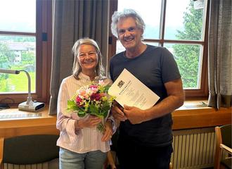 Mit einem geschmeidigen Vierzeiler schloss Rektor Manzenberger seine Betrachtungen, überreichte die Glückwunschurkunde der Regierung garniert mit Blumen des Kollegiums und wünschte für die nächsten 25 Jahre alles Gute.