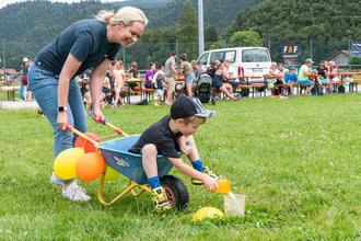 Unterwössen. Das war ein toller Nachmittag im Kindergarten-Sportfest auf dem Rasen des an den Kindergarten angrenzenden Sportplatzes. Ganz besondere Aufgaben hatten sich dessen Mitarbeiterinnen um Leiterin Birgit Dupke und der Elternbeirat ausgedacht. Sechs Aufgaben warteten auf jedes Kind und seine Familie. Es galt im Schubkarrenrennen zu bestehen. Im Grasski-Slalom mussten die Kinder auf sehr langen Skiern miteinander die Route um die ausgelegten Hütchen bewältigen. Was Sackhüpfen ist, wusste ein jedes Kind. In der Handtuchstaffel lernten sie im Paar auf einem zwischen ihnen gespannten Handtuch einen Ball über Hindernisse zu tragen. Und dann galt es noch mit einer Auswahl diverser Kinderfahrzeuge einen Parcour zu duchfahren. Das alles war eine Riesengaudi im schönsten Sommerwetter, eine Hüpfburg rundete den Spaß ab. Der Elternbeirat hat ein großes Kuchenbuffet initiiert. In gemütlicher Runde saßen alle beieinander und pflegten das Miteinander.