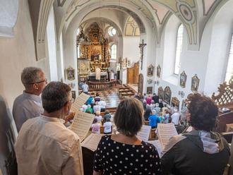 Zuvor am Morgen um 6 Uhr machten sich bei strahlendem Sonnenschein und später Temperaturen über 30 Grad die 14 Wanderer aus Unterwössen auf den Weg über die Berge zur Wallfahrtskirche Maria Eck. Die 22 Kilometer und 1500 Höhenmeter verlangte den Frauen und Männern bei der Hitze einiges ab. Bergwanderführer und Bergwachtler Sepp Auer hatte ein Auge auf seine Mitwanderer. Er kannte die teilweise nicht sichtbaren Steige und rief immer wieder zu Trinkpausen auf. Der Weg führte über die Jochbergalm, Grundbachalm, Bischofsfellnalm, Hinteralm. Nach einer längeren Kaffeepause ging es ins Weißachental hinunter und auf der anderen Seite wieder hinauf. Über die Gleichenberglalm, die Mittelstation der Hochfellnbahn, die Hocherbalm und die Hargassalm erreichten die 14 schließlich im Abstieg nach acht Stunden Maria Eck. Es blieb noch Zeit sich in der Klostergaststätte von den Strapazen zu erholen.